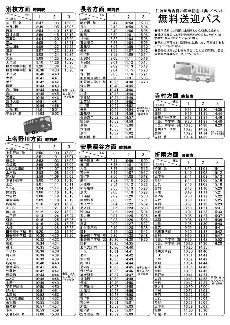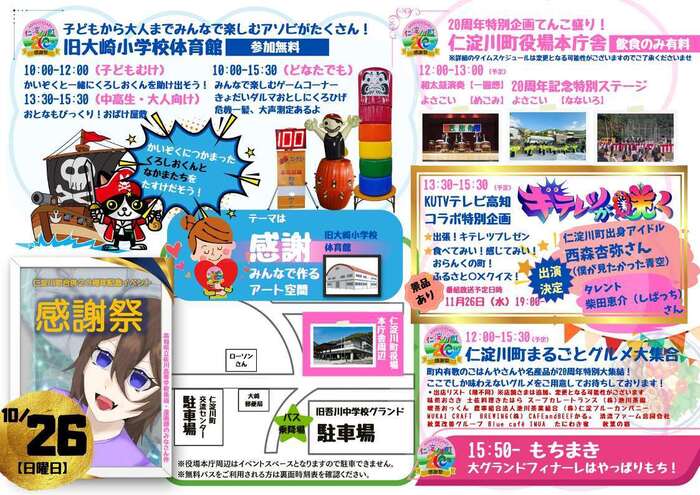 本文 仁淀川町合併20周年記念イベント HOME > 仁淀川町合併20周年記念イベント 担当 : 企画振興課 / 掲載日 : 2025/10/15 この度、仁淀川町は合併20周年を迎え、20周年イベントを下記のとおり開催します。 日時 : 令和7年10月26日(日)10:00~16:00 場所 : 仁淀川町役場本庁舎周辺 詳細は添付のイベントチラシをご覧ください。