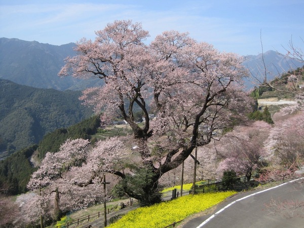 樹齢約五百年、樹高21m、根元廻り6m、県の天然記念物にも指定されているエドヒガンの古木です。花の萼筒(がくとう)下部(基部)が球状に膨らみ、横から見るとひょうたんの形をしていることから、いつしか「ひょうたん桜」と呼ばれるようになりました。また、「ひょうたん桜」のある地区は元々「大藪」という字名でしたが、この桜にちなんで昭和33年に「桜」と改称されました。